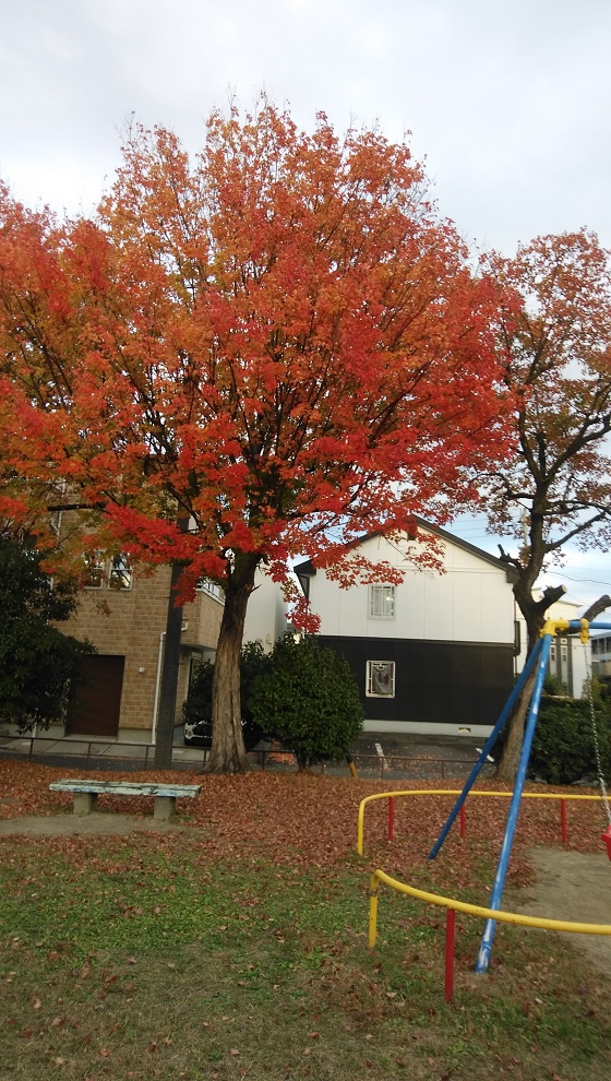 近所の公園の紅葉は真っ赤に彩り、まるで最後の力を振り絞って色づいているようです。