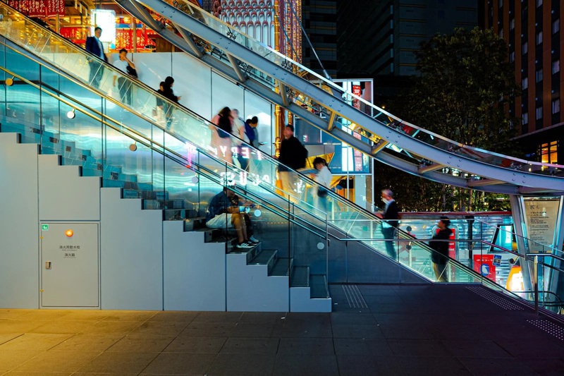 右側を歩いて昇る、降りる人をカメラが察知して「警告のサイレンが鳴る」 「危ない! 止まりましょう!」とテープ音がこだまします。